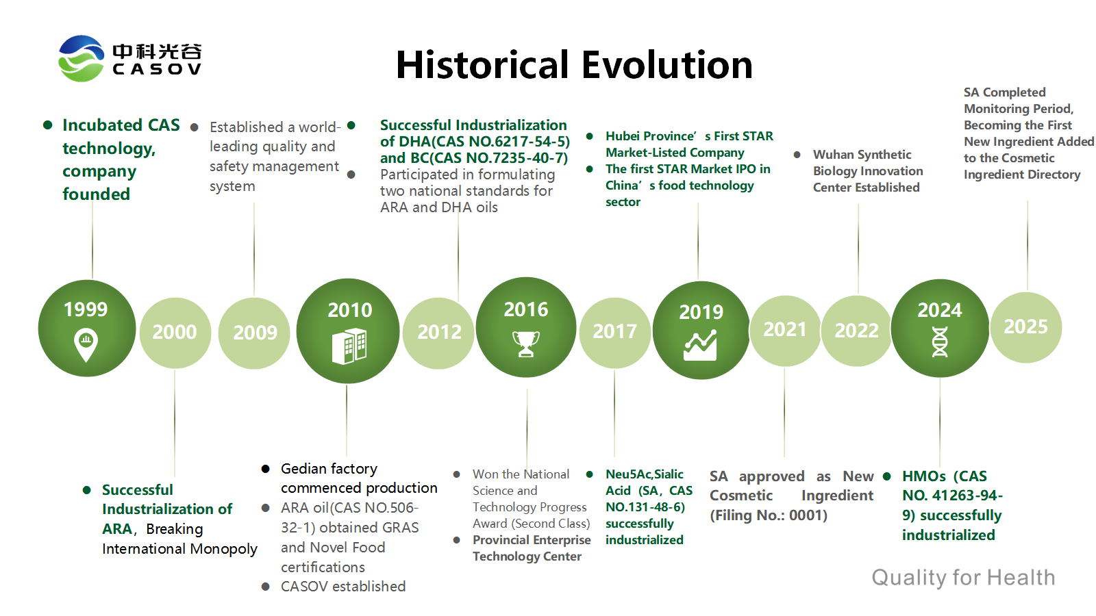 Wuhan CASOV Green Biotech Co., Ltd., filial de CABIO Group (código bursátil: 688089), empresa que cotiza en el mercado STAR, aprovecha los recursos tecnológicos de la Academia China de Ciencias y un moderno sistema de I+D para centrarse en la biofermentación, el desarrollo de ingredientes funcionales y sus aplicaciones. Reconocida como "Empresa Nacional de Alta Tecnología" en octubre de 2014, la compañía opera como el Centro Provincial de Bioingeniería para la Innovación en Tecnología Industrial de Hubei y como entidad gestora del Centro de Mejora Genética Biológica de la Academia China de Ciencias, manteniendo una estrecha colaboración con el equipo de investigación sénior de los Institutos de Ciencias Físicas de Hefei de la Academia China de Ciencias para impulsar la innovación tecnológica continua.